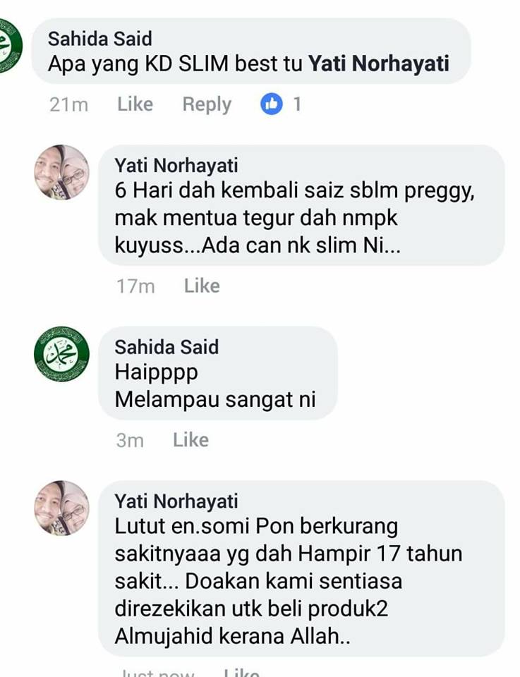 Lutut en.suami pun dah berkurang sakitnya yang dah hampir 17 tahun sakit. Doakan kami sentiasa direzekikan untuk beli produk- produk Al mujahid kerana Allah.”