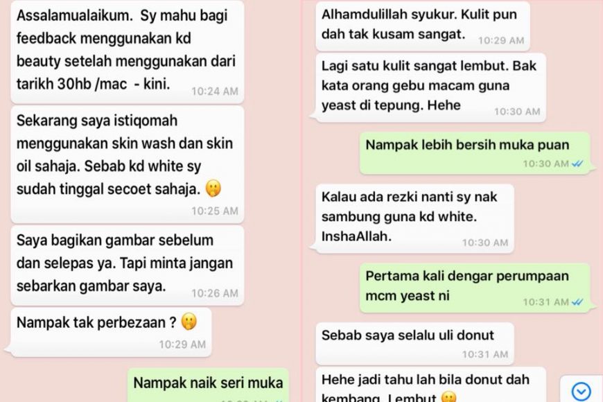 Perubahan kulit wajah lebih cerah dan nampak berseri. Dahulu sebelum menggunakan KD wash, KD skin oil & KD white kulit muka nampak kusam tak bermaya. Sejak istiqomah menggunakan set KD BEAUTY kulit mula menyerlah naik seri dan menggebu seperti donut!