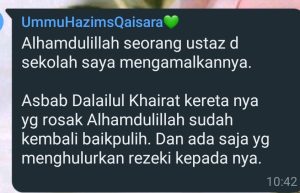 Asbab Dalailul Khairat, keretanya yang rosak Alhamdulillah sudah kembali baik pulih. Dan ada saja yang menghulur rezeki kepadanya.”
