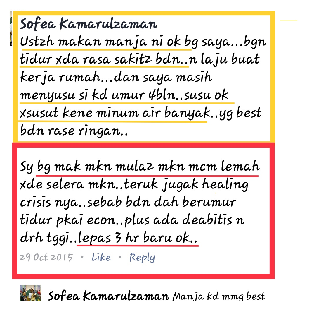 “Makan MANJA KD ni ok bagi saya. Bangun tidur tak rasa sakit-sakit badan. Laju buat kerja rumah dan saya menyusu baby berumur 4 bulan. Susu ok tak susut, kena minum air banyak. Yang best badan rasa ringan.”