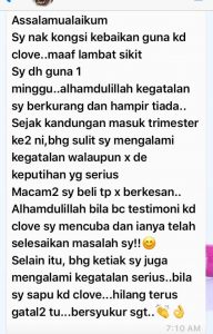 Alhamdulillah bila baca testimoni kd clove saya mencuba dan ianya telah selesaikan masalah saya!!?