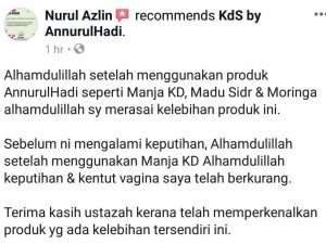 Alhamdulillah setelah menggunakan produk AnnurulHadi seperti Manja KD, Madu Sidr & Moringa alhamdulillah sy merasai kelebihan produk ini.