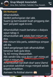 Apa ada pada nya? Ianya suatu ni’mat kepada kami juga yang lain. Sewaktu covid, pesakit yang oksigen dah drop 82, diberikan minum Air Doa Ulama ANNURULHADI, Alhamdulillah tak sampai 5 minit, oksigen naik. Tak percaya tanya je kat Khatijah Nayan . K jah bagitahu saya. Masa itu bantuan Allah untuk along begitu cepat. Barkah K Jah solawat jibril beribu kali, Alonng dibantu oleh seorang nurse untuk minum air doa ulama ANNURULHADI .