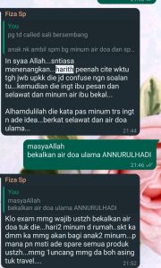 Apa ada pada nya? Ianya suatu ni’mat kepada kami juga yang lain. Sewaktu covid, pesakit yang oksigen dah drop 82, diberikan minum Air Doa Ulama ANNURULHADI, Alhamdulillah tak sampai 5 minit, oksigen naik. Tak percaya tanya je kat Khatijah Nayan . K jah bagitahu saya. Masa itu bantuan Allah untuk along begitu cepat. Barkah K Jah solawat jibril beribu kali, Alonng dibantu oleh seorang nurse untuk minum air doa ulama ANNURULHADI .